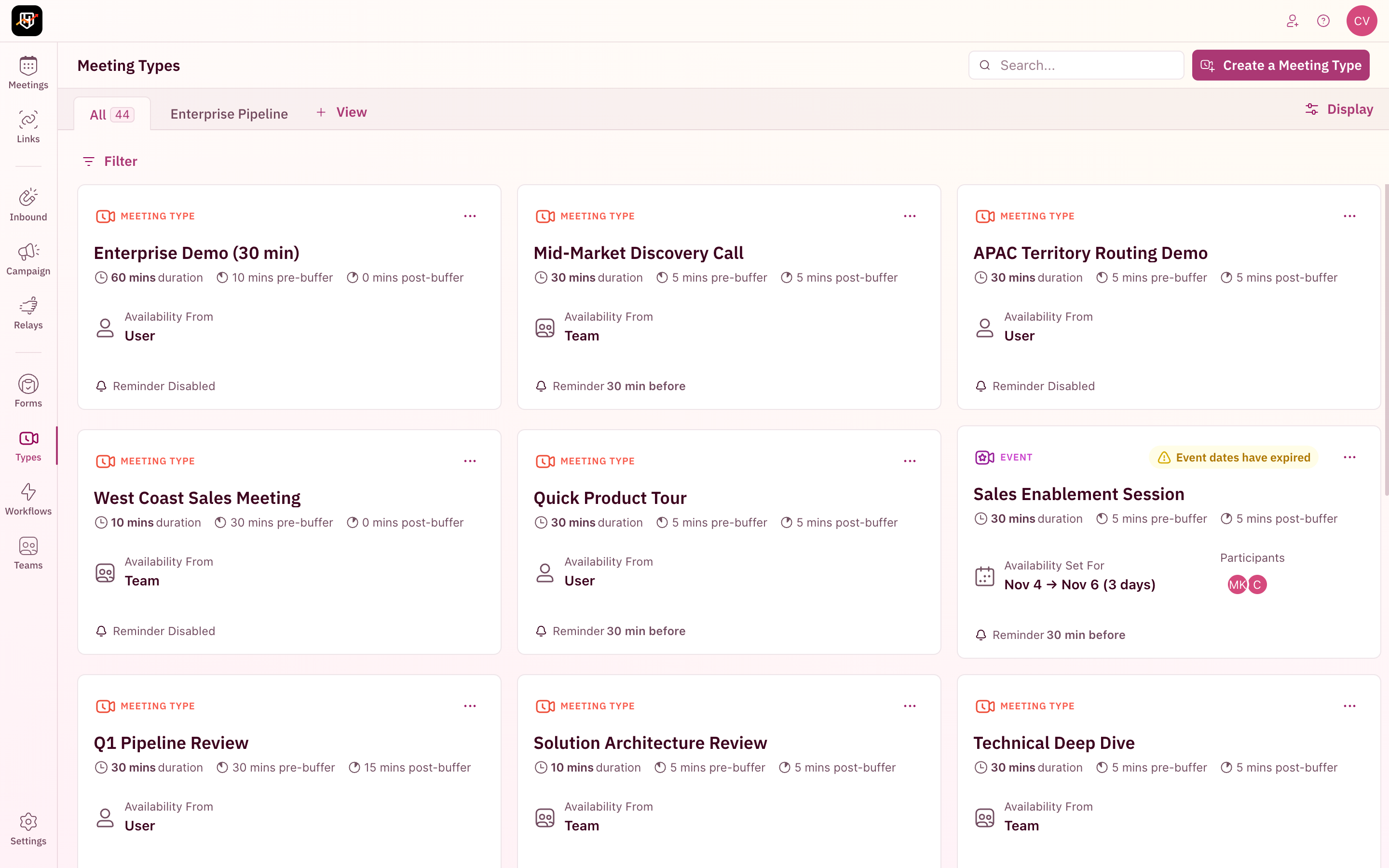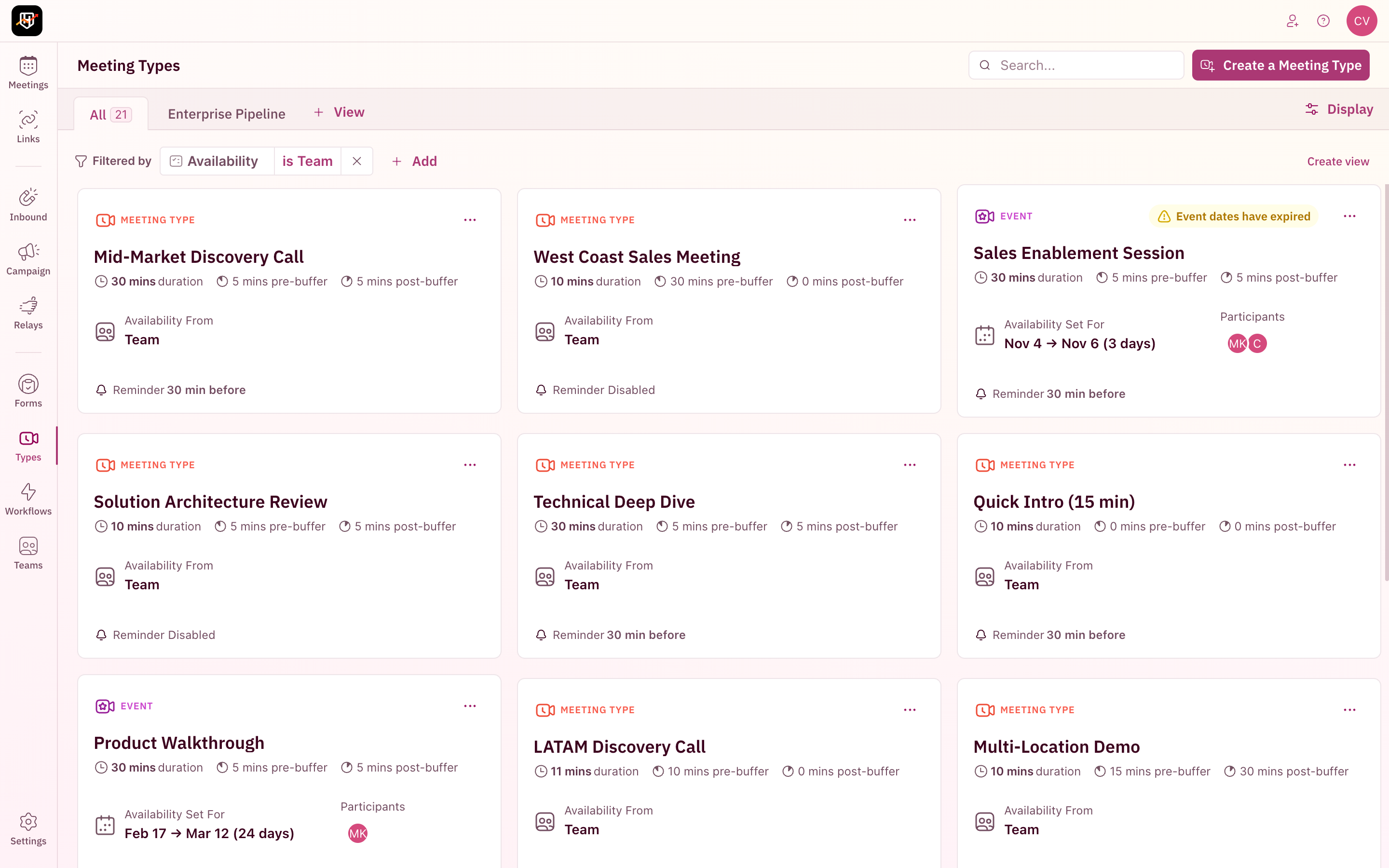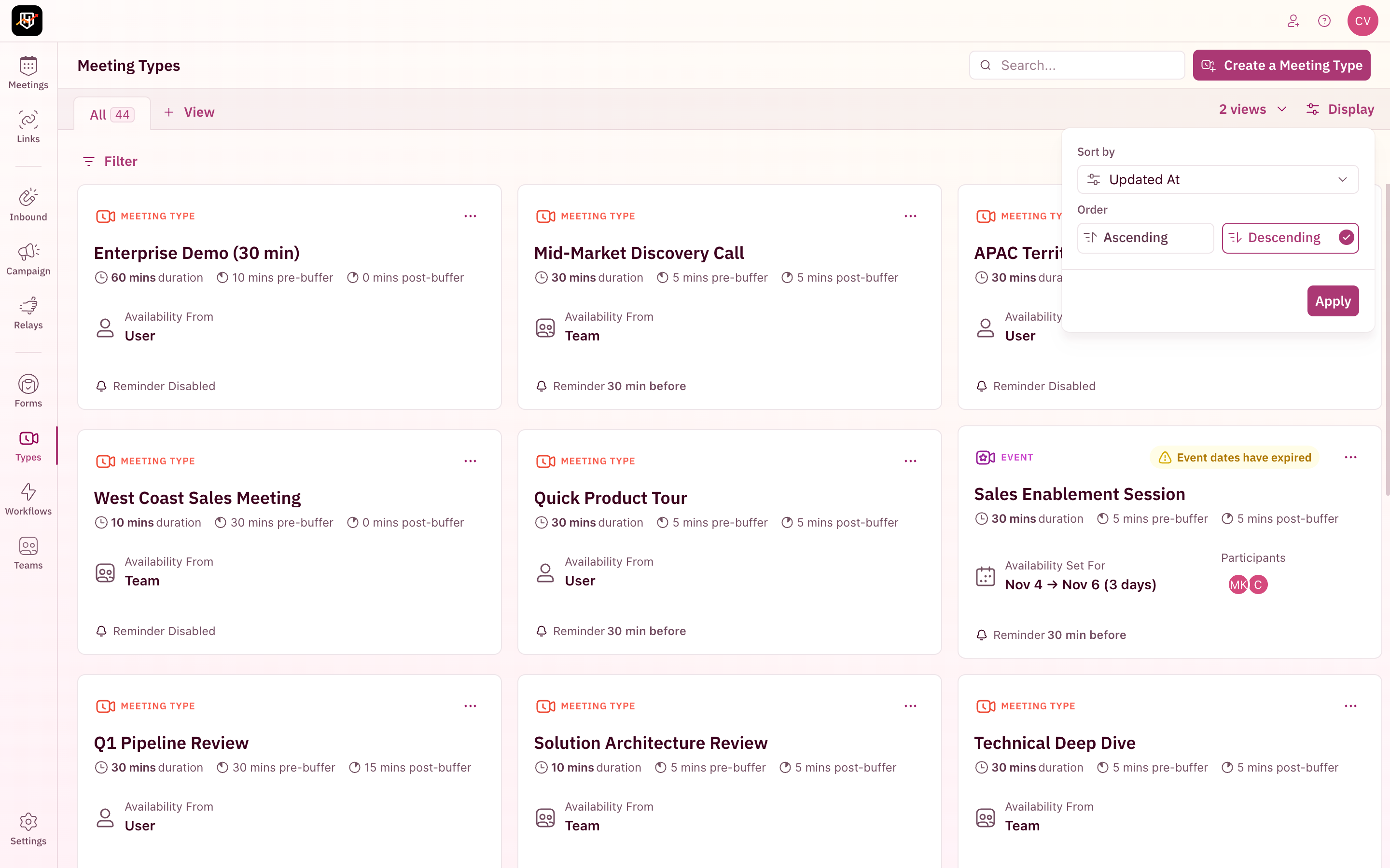 Every filter, search term, and display setting is reflected in the page URL. Copy the URL from your browserâs address bar to share your exact view with a teammate. If you filter Meeting Types by a specific category and sort by name, the URL encodes that state. Anyone who opens that URL sees the same filtered, sorted view. Useful for sharing specific views in Slack or bookmarking commonly used filter combinations.Your resources are organized. No more scrolling through dozens of items to find the one rule you need to edit. Search, filter, and view your way. đđđ