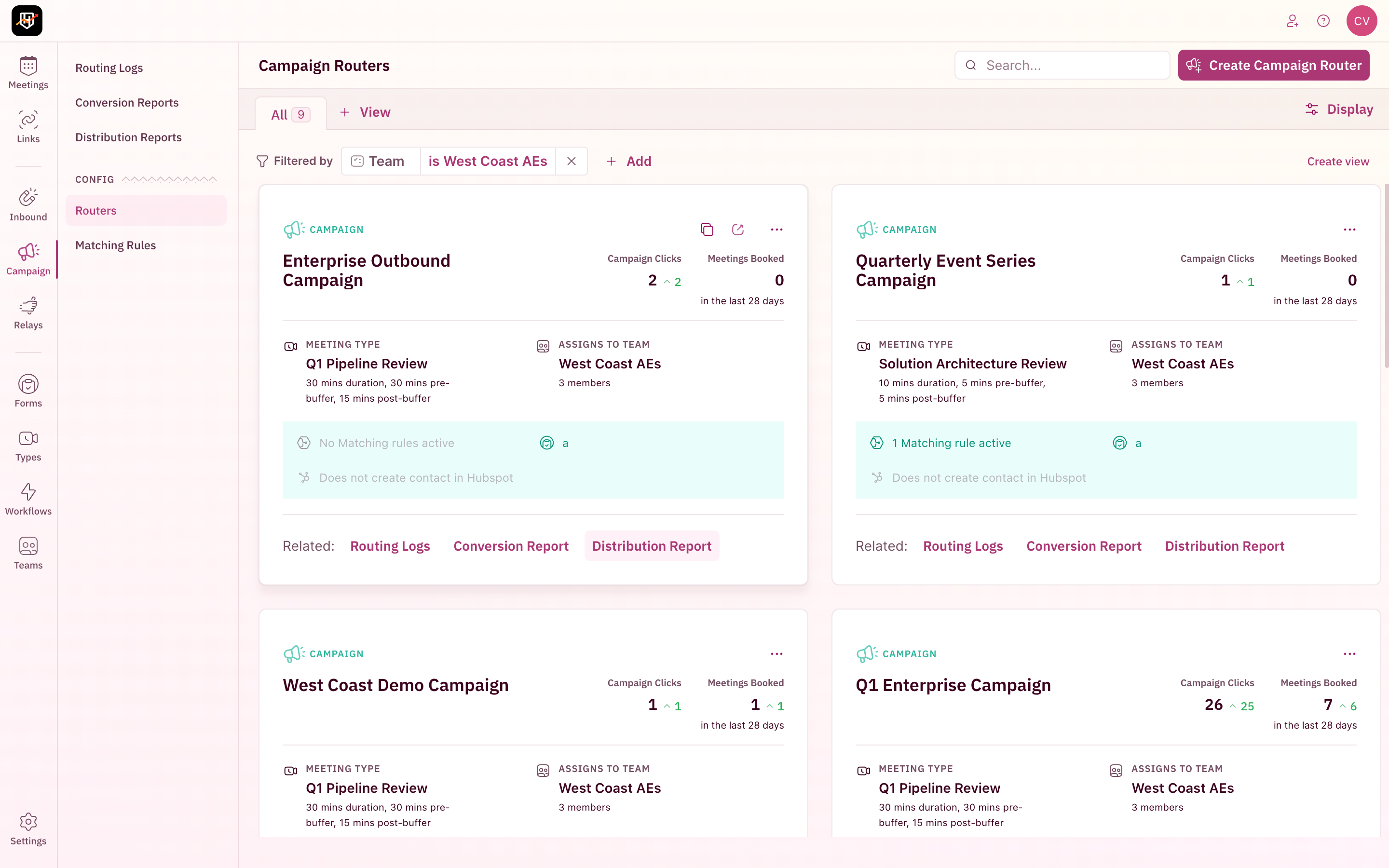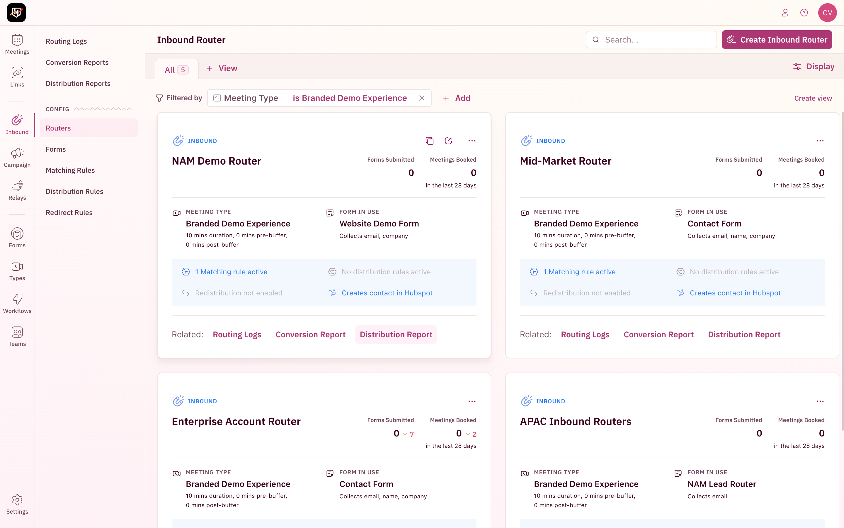 | Campaign Routers | Distribution, Assign CRM Owner, Team, Meeting Type, Member, Matching Rule, Create Lead, Update Lead Fields, Create Contact, Update Contact Fields, Marketing Form, Created At |