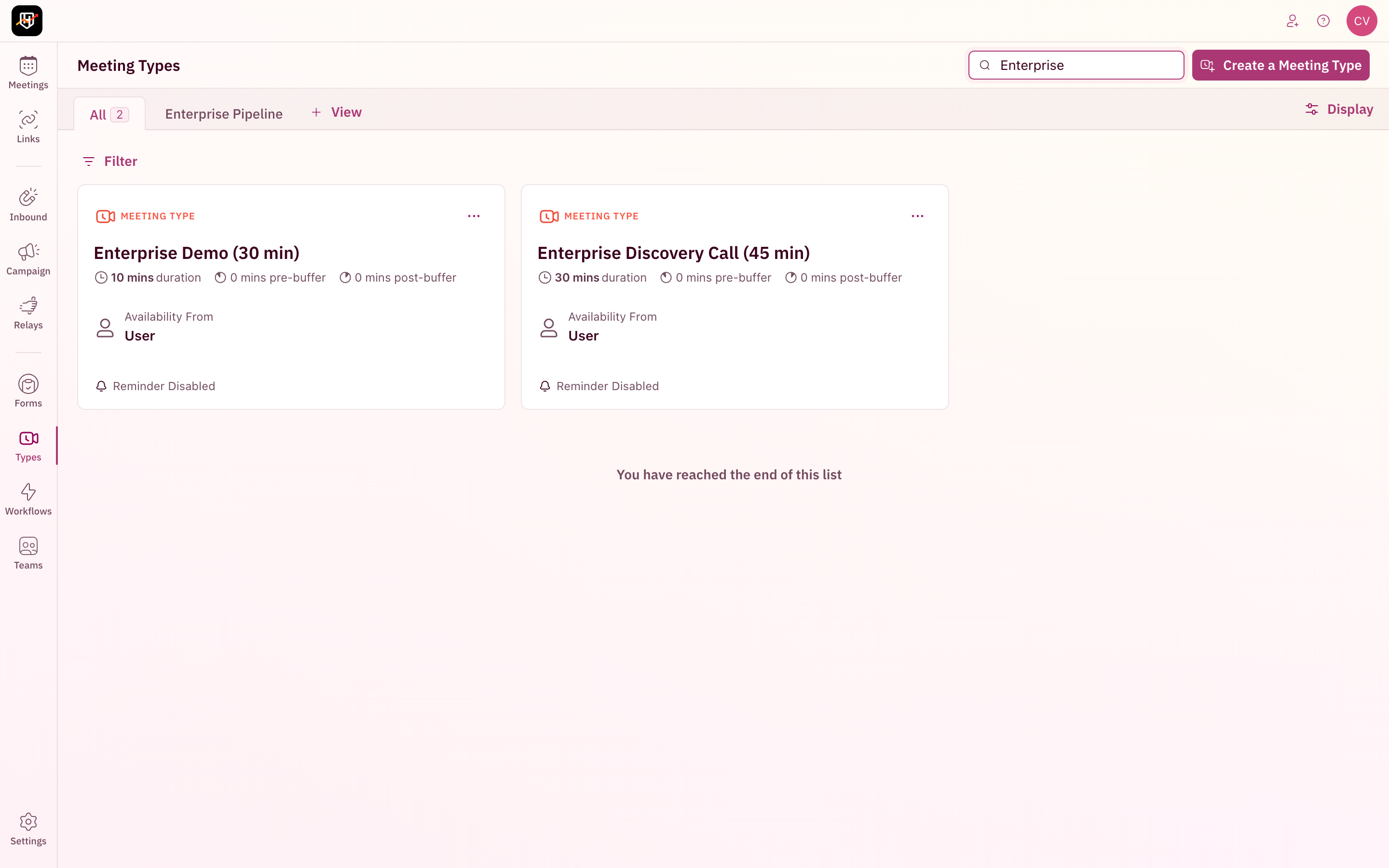 The Search⌠bar sits in the top right of every resource page. Start typing and results narrow in real-time. Search matches against the resource name, so typing âEnterpriseâ instantly surfaces only the meeting types with that term.