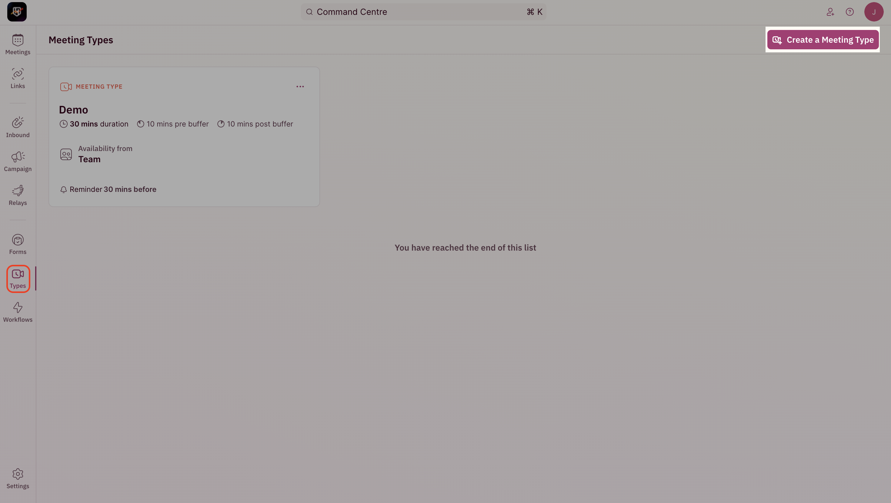 - To create a Meeting Type, use the side nav bar and click on Types -> “Create a Meeting Type” button.