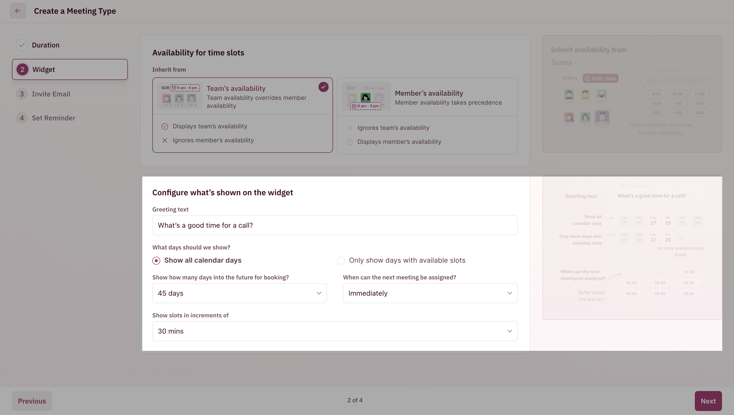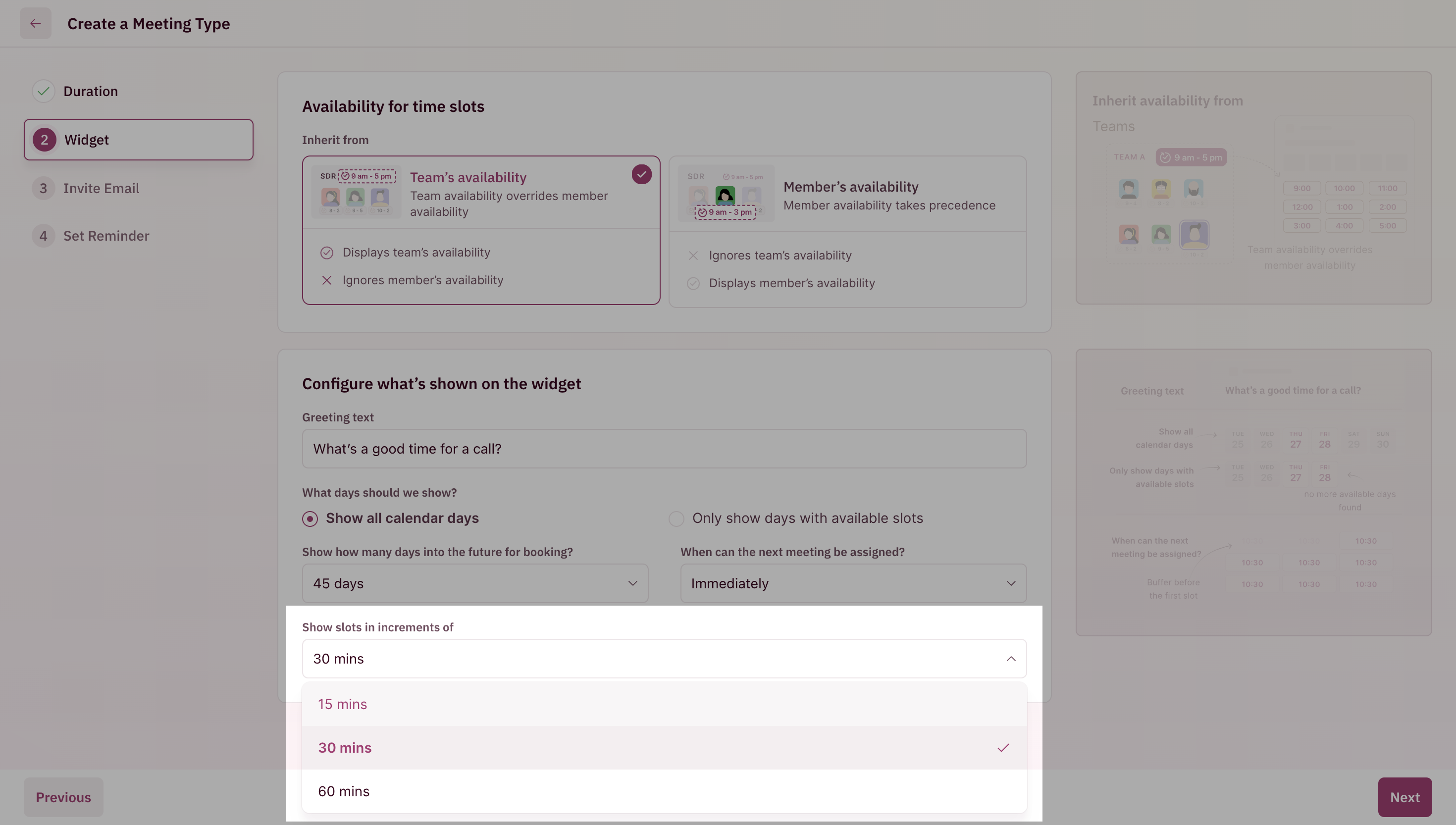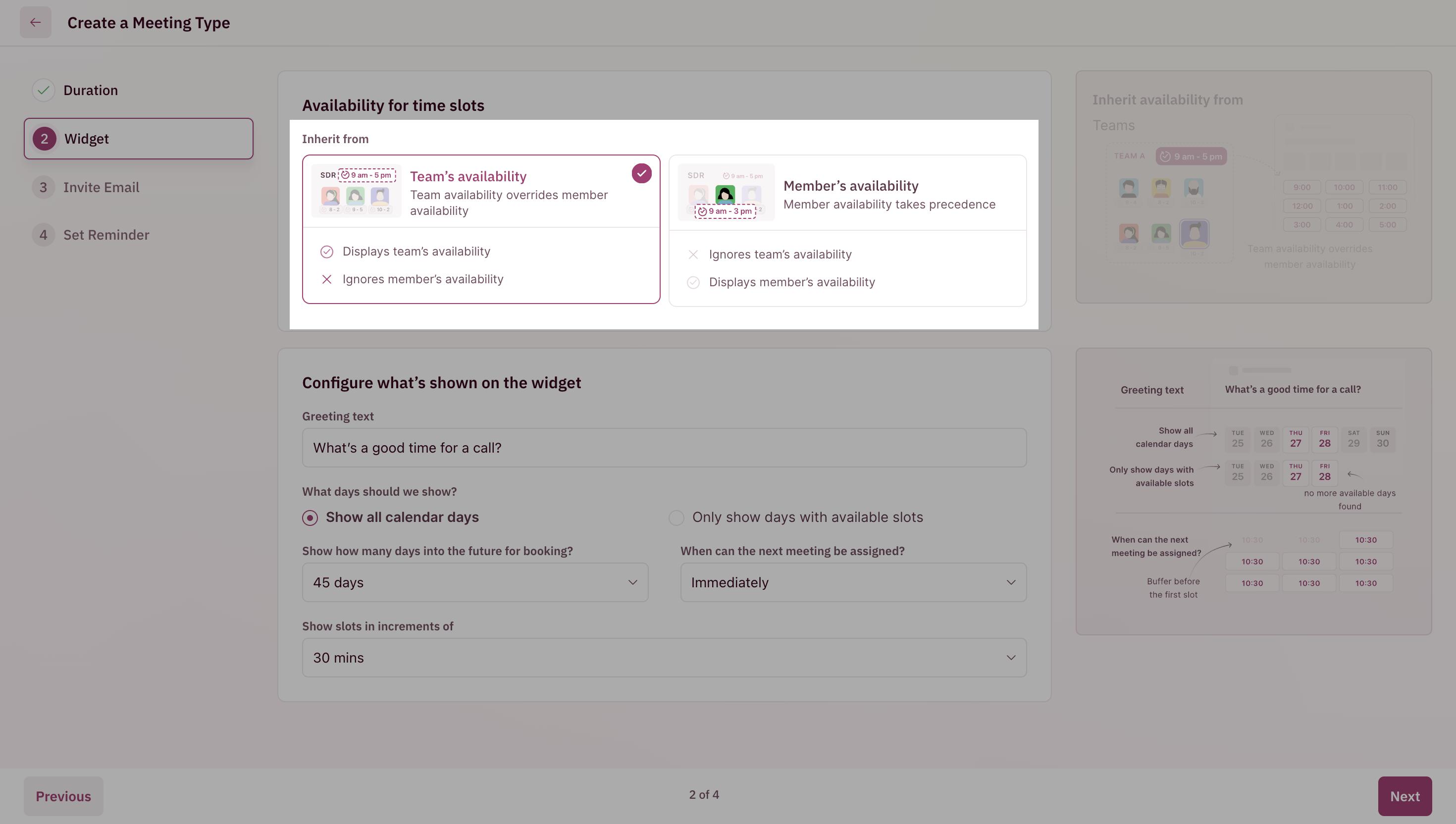 Configuring Meeting Type involves choosing availability between team vs members, changing your greeting text, and selecting how far into the future you want to display your calendar slots. Let’s look at each of them one by one.Choose how time slots should be shown