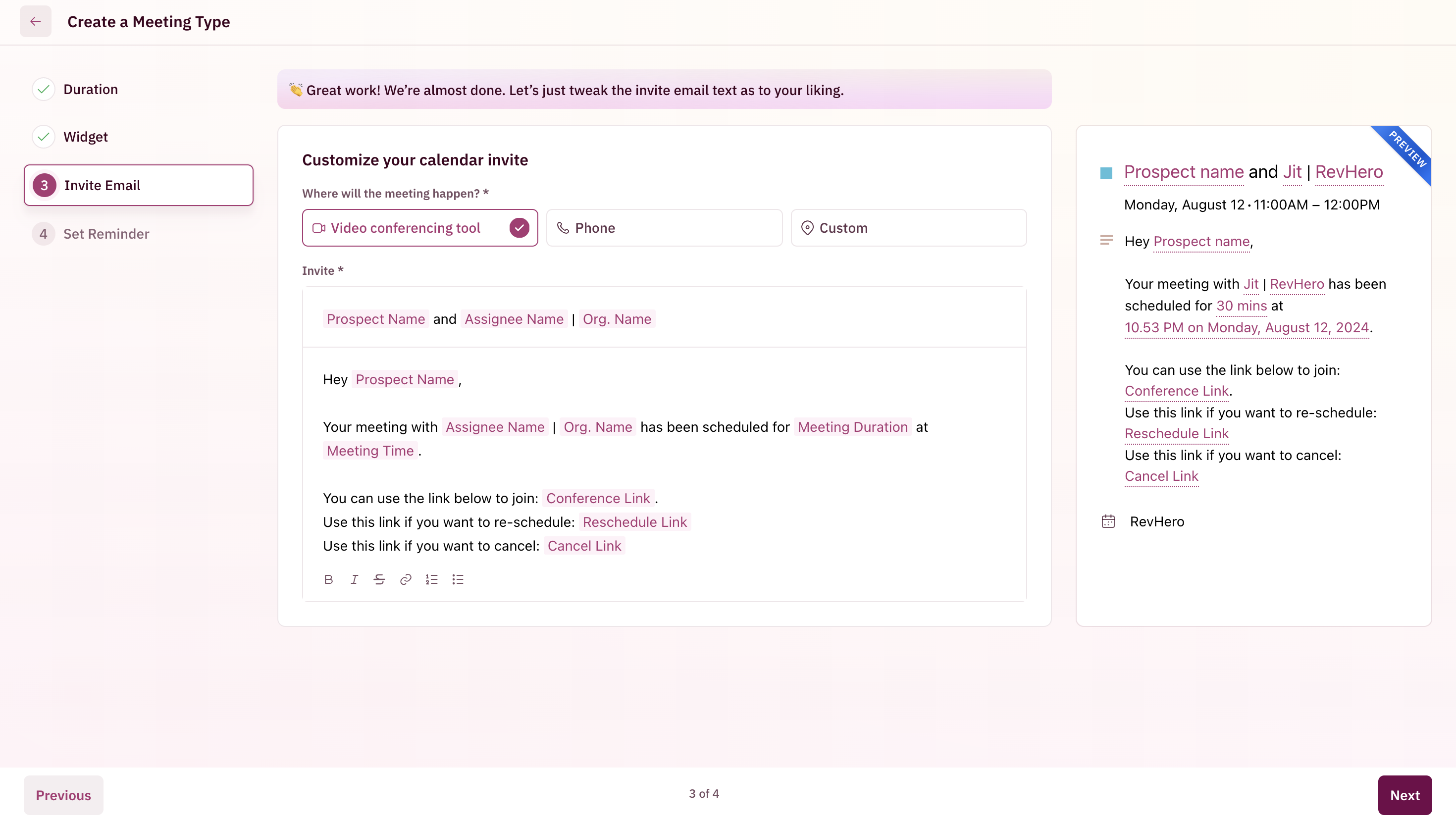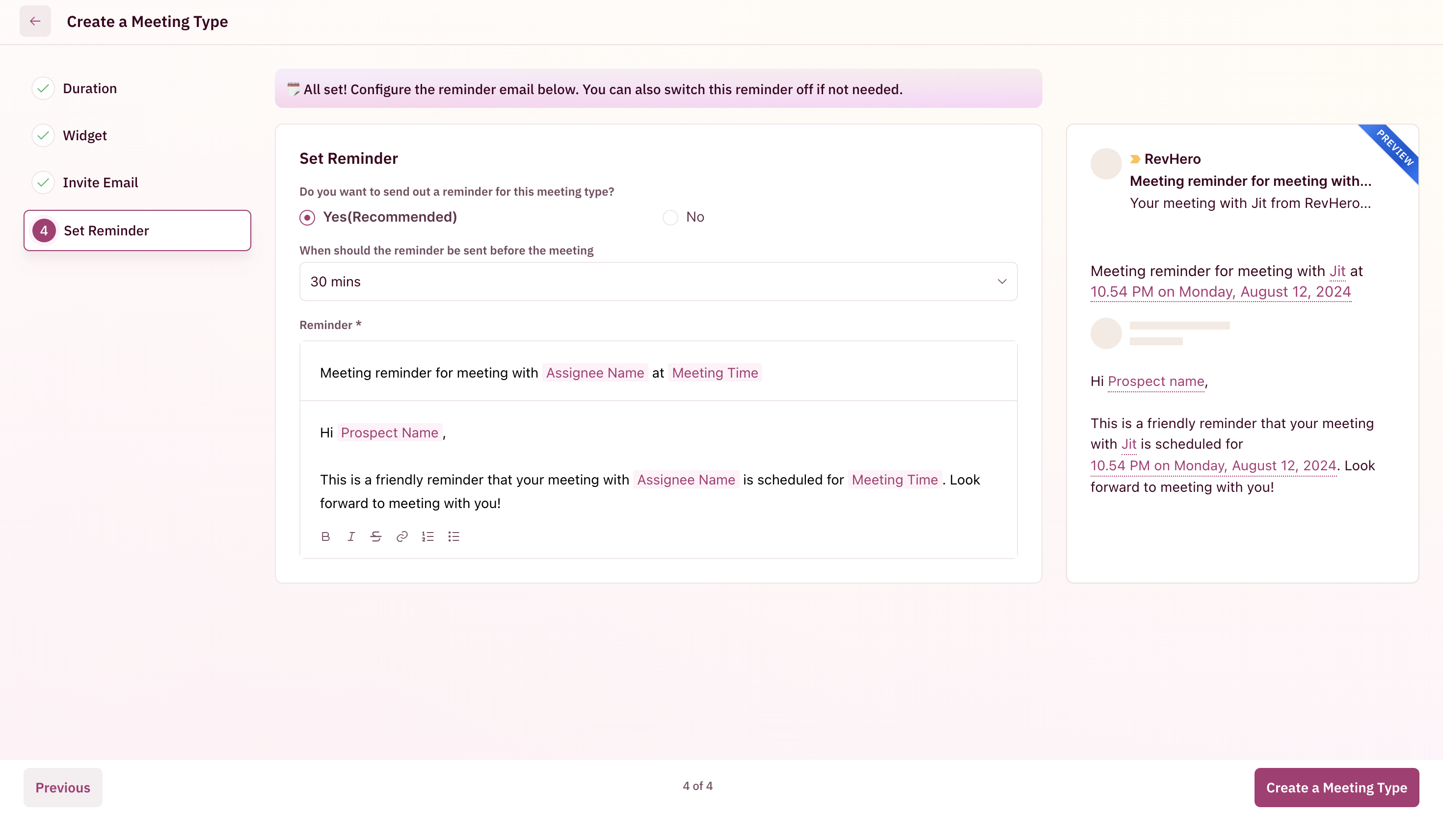 You can choose to send one reminder email (or not send it) before your call begins. You can customize its contents and ensure you have higher chances of people showing up for your demo calls.NOTEYou can create multiple reminders using RevenueHero’s workflows.
