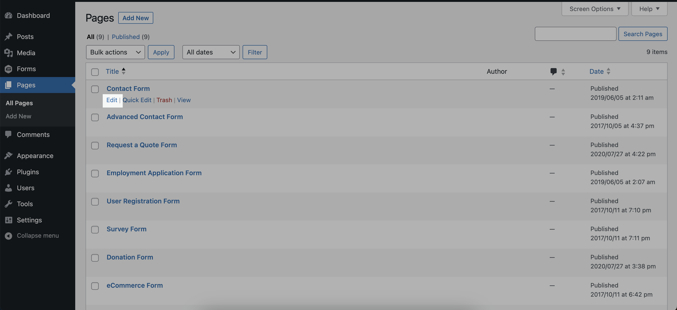 - Go to your Gravity Forms account and navigate to your landing page by going to Sidebar -> Pages -> Landing Page -> Edit
