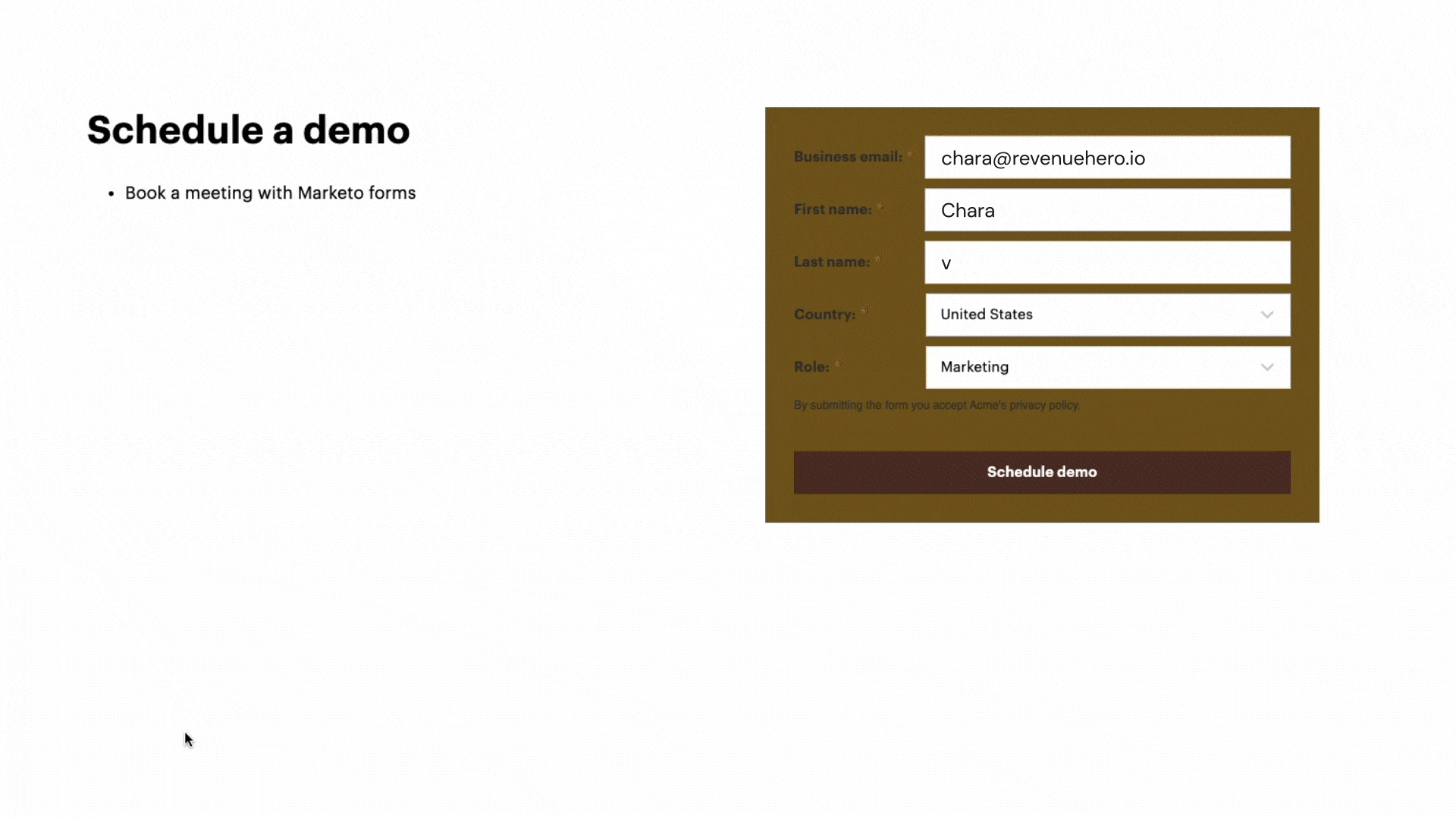 Paste the scheduling snippet after your Marketo form snippet on the page. RevenueHero’s native scheduling snippet listens to your Marketo form data and triggers the scheduler depending on your distribtion rules configured in your app. By mapping the marketo form ID to your router, RevenueHero automatically listens to the right form submit even if your page has multiple marketo forms. Once a meeting is booked, the event details are synced with your CRM as a activity/engagmenet depending on whether you use Salesforce or Hubspot. RevenueHero doesn’t interfere with any of your attribution or data workflows from Marketo. Marketo collects the lead information and creates your lead record in Salesforce per usual. RevenueHero listens to form fill, and displays the scheduler to the user. The details of the booked meeting is automatically synced against the created lead’s associated event.